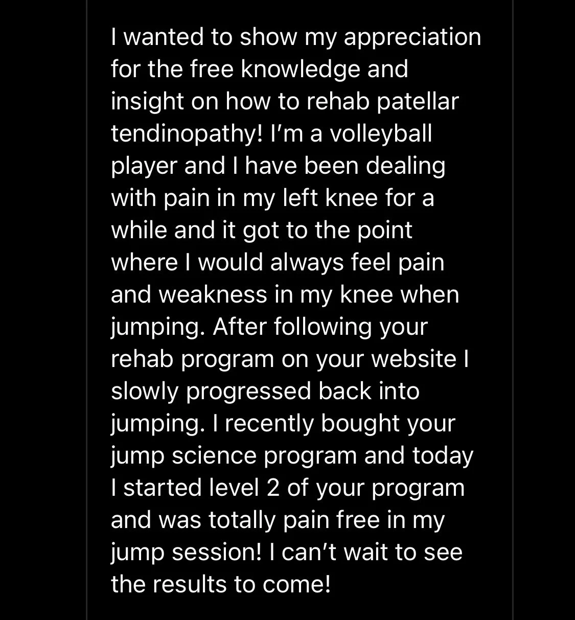 STEP 1: STOP JUMPING. It is very difficult for a tendon to heal if it continues to go through high stress athletic activity. Jumps feature a sudden, violent yank on the patellar tendon with peak forces that can exceed 10x body weight (depending on the person and the exact type of jump). Athletes get much faster progress if they stop jumping, and truthfully, it’s best to stop athletic activity in general. Admittedly there are scenarios in which people just do consistent therapeutic exercises on top of their normal athletic activity and still make progress. But this approach slows the process significantly and often creates an endless cycle of short-term improvements followed by setbacks.